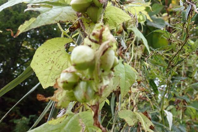 お別れを志津温泉のの山菜鍋を食べながら。秋を告げる一年草(雄性両全性異株)ミヤマニガウリ裂果の始まり.両性花を周囲の葉が幾重にも包み込んでくれて開花の手助けをするという珍しい植物に迎えられながらの会食でした。