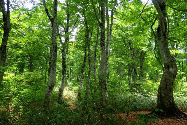 ブナの森です。緑がたちはだかってきます。色々な緑です。木漏れ日が千変万化の彩りを作ります。私は何で迫ろうか。自然は厳しいです。