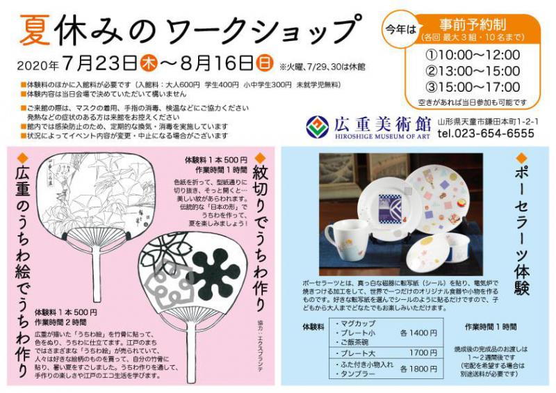 \\夏休みのワークショップ//コロナ対策をして今年も開催します。会期◆2020年7月23日(木)〜8月16日(日)...    ※火曜日と7/29、30は休館時間◆@10:00〜12:00 A13:00〜15:00 B15:00〜17:00    今年は事前予約制(各回 最大3組・10名まで)    空きがあれば当日参加も可能です〈体験メニュー〉【広重のうちわ絵でうちわ作り】 体験料1本500円/作業時間2時間 広重が描いた「うちわ絵」を竹骨に貼って、色をぬり、うちわに仕立てます。江戸のまちではさまざまな「うちわ絵」が売られていて、人々は好きな絵柄のものを買って、自分の竹骨に貼り、暑い夏をすごしました。うちわ作りを通して、手作りの楽しさや江戸のエコ生活を学びます。【紋切りでうちわ作り】 体験料1本500円/作業時間1時間 色紙を折って、型紙通りに切り抜き、そっと開くと…美しい紋があらわれます。伝統的な「日本の形」でうちわを作って、夏を楽しみましょう!【ポーセラーツ体験】 体験料 マグカップ・プレート他 1400〜1800円/作業時間1時間 ポーセラーツとは、真っ白な磁器に転写紙(シール)を貼り、電気炉で焼きつける加工をして、世界で一つだけのオリジナル食器や小物を作るものです。好きな転写紙を選んでシールのように貼るだけですので、子どもから大人までどなたでもお楽しみいただけます。※焼成後の完成品のお渡しは1〜2週間後です。(宅配を希望する場合は別途送料が必要です)■体験料のほかに入館料が必要です。(入館料:大人600円 学生400円 小中学生300円 未就学児無料)■体験内容は当日会場で決めていただいて構いません。■ご来館の際は、マスクの着用、手指の消毒、検温などにご協力ください。発熱などの症状のある方は来館をお控えください。■館内では感染防止のため、定期的な換気・消毒を実施しています。■状況によってイベント内容が変更・中止になる場合がございます。申込み◆広重美術館(tel.023-654-6555)
