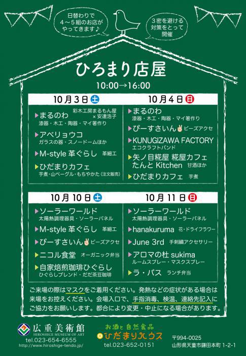 広重美術館とひだまりハウスでは、これまで春と秋に「ひろまりプチマルシェ」を開催してきましたが、新型コロナウイルスの影響で2020年春は中止せざるを得ませんでした。そこでこの秋は、3密を避ける対策をとって「ひろまり店屋」を開催します。開催日は4日間、日替わりで4〜5組のお店がやってきます。規模は縮小となりますが、楽しい時間をお過ごしいただけましたら幸いです。日時/2020年   10月3日(土)・4日(日)・10日(土)・11日(日)     10:00−16:00場所/広重美術館前駐車場・アートスペースばれん 【ご来場の皆様へのお願い】・会場内ではマスクをご着用ください。・発熱などの症状がある場合は来場をお控えください。・会場入口で、手指消毒、検温、連絡先記入にご協力をお願いします。・飲食スペースは屋外とします。・新型コロナウイルスの状況によっては変更・中止になる場合があります。 広重美術館 tel.023-654-6555ひだまりハウス tel.023-652-0151〒994-0025 山形県天童市鎌田本町1-2-1