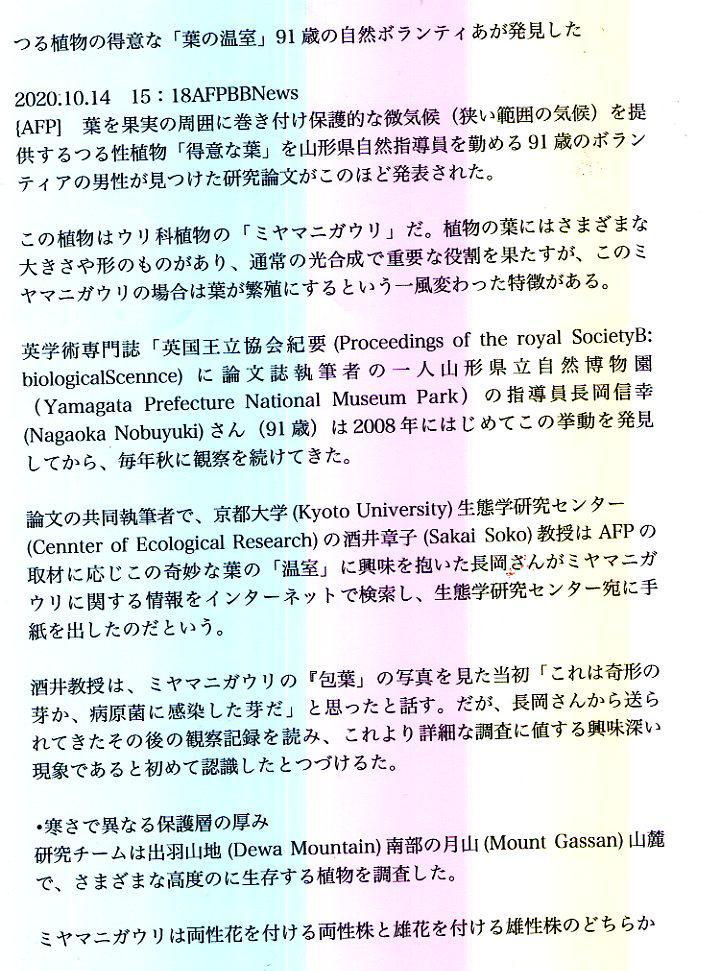 自然大好き月山の山オヤジ HP http://samidare.jp/gassan/ のミヤマニガウリの葉が自発的に囲い込む仕草発見した長岡です。/0/7 京都大森林研究所、生態学研究センターの酒井教授、森林総合研究所の直江先生中心に論文作成、英国王立協会紀要が掲載されました。光合成と葉としての役割以外葉が自ら苞葉し包み込む仕草は初ということ。十数年観察し資料を送り届けたことがきんきゅうの元になったわけです。京大の心温まるうけいれが10年も続けられた京大の体制の凄さをにたいし中心から賛辞を贈ります。わたしたちの資料と論文によりこれから更なる細部観察を皆さんに一読していただき、「一年草で巻きひげ一つで成育のため、greenhouseを作り、寒さをしのぐ生き様を賛辞し、見習いたいものです。