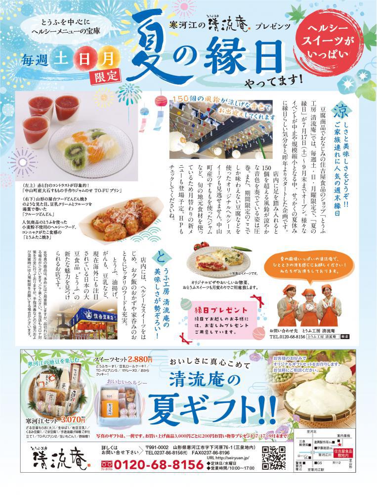 ●夏野菜トマトピザ(月替わり商品)あま〜いトマトやズッキーニなどたっぷりの夏野菜を手づくり油揚げにのせて焼き上げてます。¥650(税込) ●フルーツどんどん(月替わり商品)豆乳クリームとフルーツを春巻きのように巻いた「フルーツどんどん」山形名物どんどん焼きを夏の冷たいフルーツバージョンに♪¥580(税込) ●すももジャム×TO-FUプリン (月替わり商品)清流庵人気のTO-FUプリンに中山町産大石すももの手作りジャムをた〜〜〜っぷり入れました!プリンの味とジャム酸味シェアして味わってくださいね。¥280(税込)
