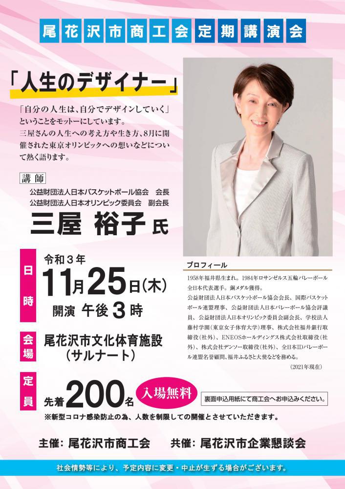 【講 師】三屋裕子 氏【テーマ】人生のデザイナー日 時:令和3年11月25日(木)15:00〜場 所:尾花沢市文化体育施設(サルナート)定 員:先着200名 ※新型コロナウイルス感染防止の為、人数を制限しての開催とさせていただきます。入場料:無料 申込みについては添付の参加申込用紙に記入のうえ、商工会へFAXまたは郵送でお申込みください。