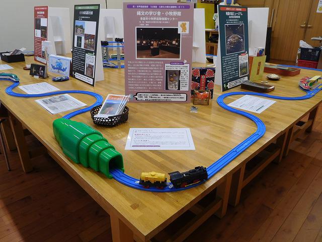 今年度のミニ企画展は、にっぽんの博物館めぐりと題して、北海道から九州まで9つの遺跡博物館をパネルで紹介しました。旅気分で、疲れた心をリフレッシュしてもらえたらという思いで、展示の周りに乗り物を走らせたり、パネルを見てお気に入りの博物館に投票してくれた方には、各地の銘菓のプレゼントするという企画も行いました。