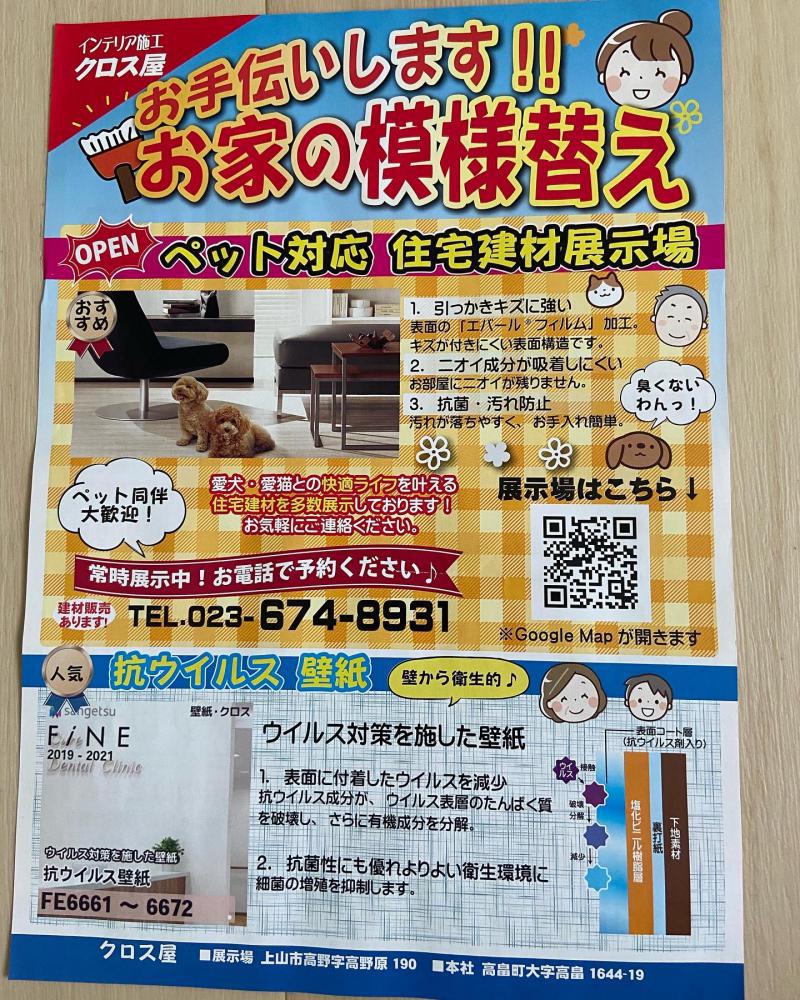 インテリア施工クロス屋です。お盆休みも終わり、今年もあと残すとこ約4ヶ月ですね。コロナもまだ増えてきてますね?そんな時抗ウイルス壁紙に張替えしてみてはどうでしょうか?壁紙表面に付着したウイルスを減少。抗菌性にも優れよりよい衛生環境。壁から衛生的に。見積もりは無料。お気軽にご相談下さい。023-674-8931まで