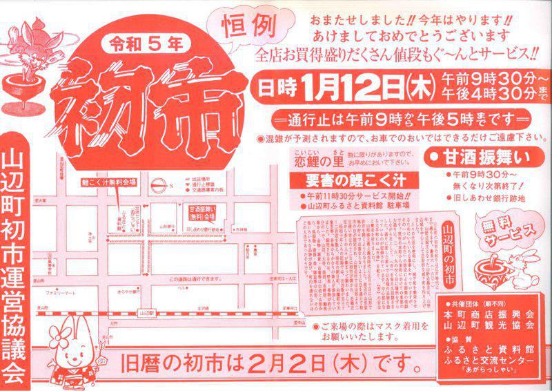 1月12日(木)は、山辺町「初市」を開催します。山辺町初市は江戸時代より続いている伝統行事です。本町通りに、縁起物のだんご木や初あめ、木工品等の露店が立ち並びます。今年は要害の鯉こく汁と甘酒の無料振舞いも行わます。皆さまのお越しをお待ちしております(^^)/なお、旧暦初市は2月2日(木)に開催いたします。 日時:令和5年1月12日(木)時間:午前9時30分〜午後4時30分 場所:本町通りお問い合わせ:山辺町初市運営協議会 023-664-5939(商工会内)