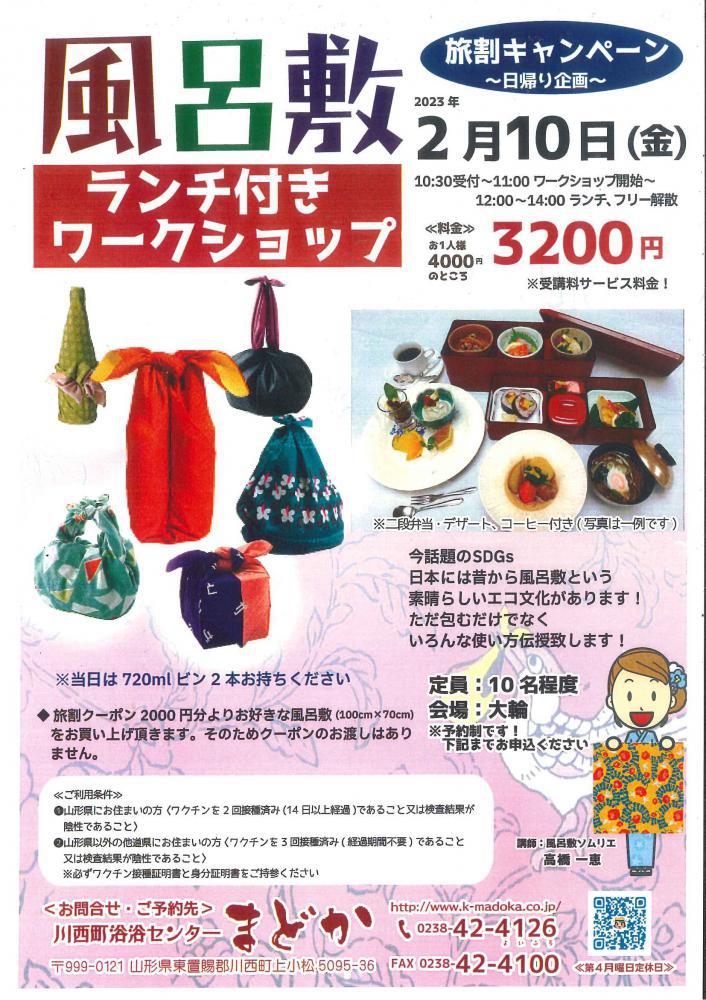 2023.2月10日(金)風呂敷ワークショップ(ランチ付き)〜旅割キャンペーン・日帰り企画〜●時間:10:30〜受付    11:00〜ワークショップ開始〜    12:00〜14:00 ランチ、フリー解散●定員:10名程度●会場:大輪●料金:お一人様4000円の所→3200円(旅割キャンペ-ンで20%OFF)※他旅割地域限定電子クーポン2000円より、お好きな風呂敷(100cm×70cm)をお買い上げできます。そのため、クーポンのお渡しはありません。《ご利用条件》 ワクチン接種証明(県内2回以上)・県外3回以上の接種証明と身分書を持参下さい!!※予約制です。ご予約はTEL0238-42-4126までお申し込みください。