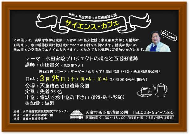 水田実験プロジェクトの現在と西沼田遺跡というテーマで、講師の先生の講演会とカフェトークを開催します。弥生・古墳時代の稲作っていったいどんなものだったのでしょうか?これまでの研究でわかったこと、今実験で解明しようとしていること、現代の稲作との違いなど…最新の研究成果についてのお話を聞いてみませんか?後半は、講師の先生を囲んでのカフェタイムです。講演を聞いての疑問や質問などを直接先生方に聞くこともできますよ。西沼田遺跡公園で3年ぶりの講演会事業です。ぜひお気軽にご参加ください。(参加には事前の申し込みが必要です) 3/25(土)「サイエンス・カフェ」(イベント情報のページへ移動します) 講師:山田昌久氏(東京都立大学教授、水田実験比較プロジェクト代表) コーディネーター:白石哲也氏(山形大学准教授) 司会:西沼田遺跡公園学芸員