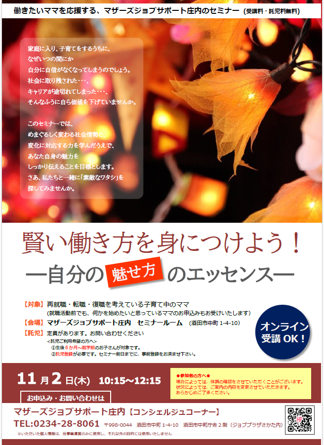 『賢い働き方を身につけよう!』〜自分の魅せ方のエッセンス〜開催のお知らせです。Zoomでも配信します! めまぐるしく変わる社会情勢と変化に対する力を学んだうえで、あなた自身の魅力をしっかりと伝えることを目標とします。さあ、私たちと一緒に「素敵なワタシ」を探してみませんか?【日 時】11月2日(木)10時15分〜12時15分 【対 象】就職を目指している子育て中のママ※就職活動前でも何かを始めたいと 思っているママもOK 【会 場】 マザーズジョブサポート庄内 セミナールーム または ご自宅でオンライン受講(Zoom)【受講料・託児料】 無料【託児】 ※事前登録・予約が必要です 保育ルーム開室日【水・木・金】の 10:00〜16:00に登録にお越し下さい。※併設の保育ルームで、保育スタッフが お子さんをお預かりします。 ママは安心して受講いただけます。★★セミナールームご利用の皆様へお願い★★場合によっては、体調の確認をさせていただくことがございます。状況によっては、ご案内の変更をさせていただきます。あらかじめご了承ください。★−−−−−−−−−−−−−−−−−−−★ ●ご自宅でオンライン受講ご利用の方へ●・インターネット環境が必要になります。 通信料は自己負担です。・パソコン、スマートフォン、 またはたタブレットをご準備いただき、 事前にZoom meetingを ダウンロードしてください。・セミナー中はカメラをオンにし、 お顔の見える状態で受講して下さい。 【駐車場について】お車でお越しの際は、中町庁舎脇にある〈セントラルホテル契約駐車場〉をご利用ください。(ジョブプラザさかたと表示してあります。)※契約駐車場が満車の場合は、酒田市中央地下駐車場をご利用ください。無料駐車券(最大2時間)を発行いたします。お帰りの際に、コンシェルジュ窓口へお声がけください。 ◇お申込み・お問い合わせ◇マザーズジョブサポート庄内TEL:0234-28-8061メールでのお申込みはコチラ