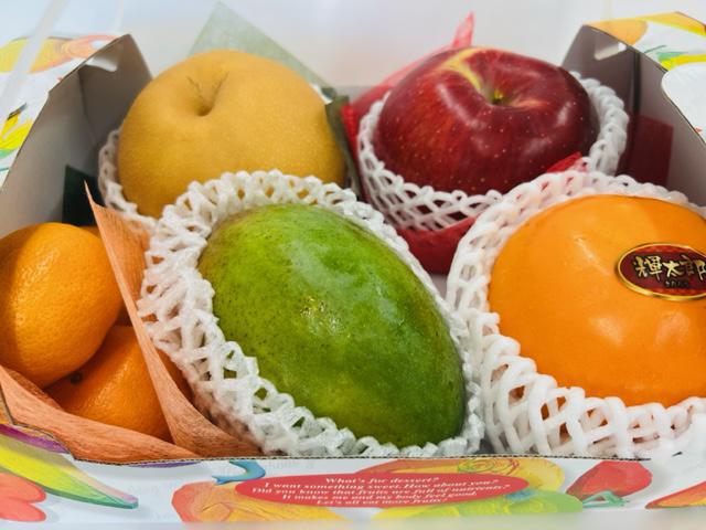ご親戚のご仏前に___お供えのフルーツギフトです。●グリーンマンゴー(アメリカ産)●輝太郎柿(鳥取産)●北原早生みかん(福岡産)●シナノスイーツりんご(山形産)●新高梨(新潟産)※10月下旬/4,000円〜4,500円(税込)のご予算で