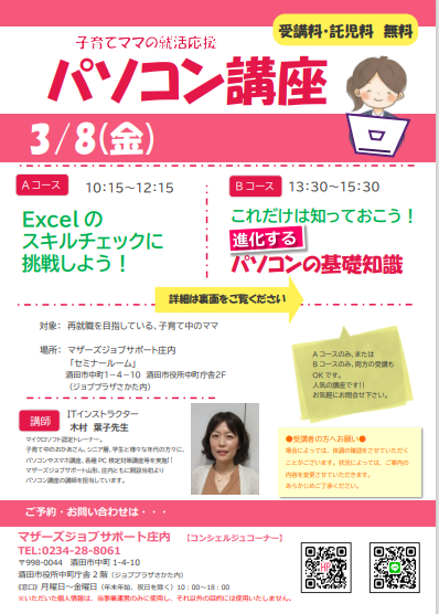 ☆マザーズジョブサポート庄内主催☆再就職応援『パソコン講座』のお知らせ ≪Aコース≫ 3月8日(金)10:15〜12:15『Excelのスキルチェックに挑戦しよう!』Excelの基本操作、実務で役立つ内容を問題にして指示された操作ができるかチェックします。解説を聞きながら操作をして理解を深めましょう! ≪Bコース≫ 3月8日(金)13:30〜15:30『これだけは知っておこう! −進化する パソコンの基礎知識−』「パソコンのシステムの各種設定はできますか?」「インターネットの接続はできますか?」「パソコントラブルが起こったとき、対応できますか?」「Al機能を使用できますか?」これらの知識もあれば、プラスαのあなたの強みになります。知っておくと、お仕事で必ず役立つ、一歩先の情報をお伝えします!日々、進化しているパソコン環境を一緒に体感してみませんか? ♪片方のコースのみ、両方のコース、どちらの受講でも可能です♪【対 象】就職を目指している子育て中のママ※就職活動前で何かを始めたいママもOK【会 場】マザーズジョブサポート庄内 セミナールーム【料 金】受講料 及び 託児料 無料【託 児】 ※事前登録・予約が必要です。 保育ルーム開室日【水・木・金】の 10:00〜16:00に登録にお越し下さい。 ※併設の保育ルームで、保育スタッフが お子さんをお預かりします。 ママは安心して受講いただけます。 【駐車場について】お車でお越しの際は、中町庁舎脇にあるセントラルホテル契約駐車場をご利用ください。(ジョブプラザさかたと表示してあります。)※契約駐車場が満車の場合は、酒田市中央地下駐車場をご利用ください。無料駐車券(最大2時間)を発行いたします。お帰りの際に、コンシェルジュ窓口へお声がけください。 ★★受講者の皆様へお願い★★場合によっては、体調の確認をさせていただくことがございます。状況によっては、ご案内の変更をさせていただきます。あらかじめご了承ください。★★ーーーーーーーーーーーー★★どうぞ、お気軽にお問い合わせくださいね。 ◇お申込み・お問い合わせ◇マザーズジョブサポート庄内TEL:0234-28-8061メールでのお申込みはコチラ