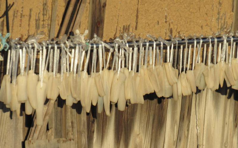●民家の小屋の軒先に凍み大根と思われるものが干してありました 寒い時に作る山形県の伝統食材の一つで凍み大根づくりは冬の風物詩の一つです 寒い時に作る独特の干し大根で「切干し大根」とは作り方食べた時の食感が違います 切干し大根は生の大根を細かく切って天日干し乾燥させますが、凍み大根は大根を縦割りにして茹でて軒先に下げて干します 独特の風味はまさに伝統食材でしょうか