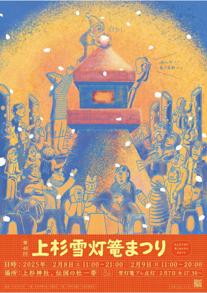 令和7年2月8日(土)・9日(日)第48回上杉雪灯篭まつり開催いたします。市民が作った180基を超える雪灯篭、雪ぼんぼり中心行事である鎮魂祭 およびろうそく献灯竹あかりとキャンドルゾーンハートのイルミネーション、各種灯りの装飾に加え東北一番桜プロジェクトでは啓翁桜の展示や、桜メッセージの募集、上杉神社では「花手水のライトアップ」、桜の木のライトアップなど見所たくさんあったか美味しいものが大集合の「テント村物産展」ステージイベントの開催ぜひご来場ください!雪灯篭まつりパンフレットPDFはこちらからご覧ください。第48回上杉雪灯篭まつりリーフレット
