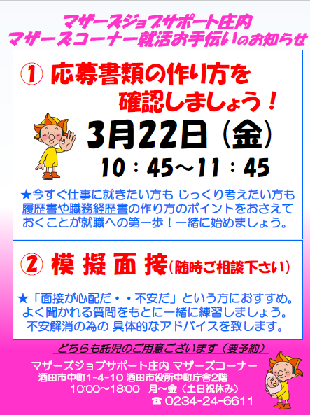 3月 マザーズジョブサポート庄内 マザーズハローワークコーナー @求職支援セミナー 『応募書類の作り方 確認しましょう!』 を行います! このセミナーは就職への第一歩! 履歴書・職務経歴書のポイント をお伝えします。 A模擬面接 ご希望に合わせ随時お受けいたします。 面接が久しぶりな方や苦手意識がある方に 特におすすめ、よくある質問をもとに練習し 具体的なアドバイスを致します。 ハローワークマザーズコーナーでは 定期的にセミナーを開催します。 奮ってご参加下さい。 受講後も疑問点など、 窓口にてご相談が受けられます。 【日 時】 3月22日(金) 10時45分〜11時45分【対 象】 お仕事探し中の子育てママさん【会 場】 マザーズジョブサポート庄内 セミナールーム【料 金】 受講料 及び 託児料 無料 ※お申込みが必要です。【託 児】 ※事前登録・予約が必要です。 ※併設の保育ルームで、保育スタッフが お子さんをお預かりします。 ママは安心して受講いただけます。 【駐車場について】 お車でお越しの際は、中町庁舎脇にある セントラルホテル契約駐車場をご利用ください。(ジョブプラザさかたと表示してあります。) ※契約駐車場が満車の場合は、 酒田市中央地下駐車場をご利用ください。 ご利用の方は、無料駐車券を(最大2時間) を発行いたします。 お帰りの際に、マザーズコーナー窓口へお声がけください。 どうぞ、お気軽にお問い合わせくださいね。 ◇お申込み・お問い合わせ◇ マザーズジョブサポート庄内 TEL:0234-24-6611(ハローワークマザーズコーナー) TEL:0234-28-8061(コンシェルジュコーナー)