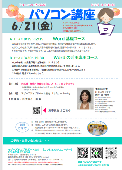 ☆マザーズジョブサポート庄内主催☆就活応援『パソコン講座』のお知らせ6月21日(金)≪Aコース≫ 10:15〜12:15『Word基礎コース』 Wordを初めて使う方や,久しぶりの方を 対象に、基本的な機能と操作方法を お伝えします。 文字入力の仕方/文章の作成/表の作成 図形の作成などについて学べます。 たかが文字入力、されど文字入力 Wordの効率的な操作方法を学んでみませんか? ≪Bコース≫13:30〜15:30『Wordの活用応用コース!』Wordを使った宛名印刷の方法を知っていますか?宛名印刷の種類と必要なもの、住所録作成の注意点などを確認しましょう。住所録やWord文章を活用し、「文章を短時間で仕上げる」コツを学びましょう!この機会に是非マスターしましょう。 ♪片方のコースのみ、両方のコース、どちらの受講でも可能です♪【対 象】再就職・転職・復職を目指している子育て中のママ※就職活動前で何かを始めたいママもOK【会 場】マザーズジョブサポート庄内 セミナールーム【料 金】受講料 及び 託児料 無料【託 児】※事前登録・予約が必要です。保育ルーム開室日【水・木・金】の 10:00〜16:00に登録にお越し下さい。 ※併設の保育ルームで、保育スタッフが お子さんをお預かりします。 ママは安心して受講いただけます。 【駐車場について】お車でお越しの際は、中町庁舎脇にあるセントラルホテル契約駐車場をご利用ください。(ジョブプラザさかたと表示してあります。)※契約駐車場が満車の場合は、酒田市中央地下駐車場をご利用ください。無料駐車券(最大2時間)を発行いたします。お帰りの際に、コンシェルジュ窓口へお声がけください。どうぞ、お気軽にお問い合わせくださいね。 ◇お申込み・お問い合わせ◇マザーズジョブサポート庄内TEL:0234-28-8061メールでのお申込みはコチラ