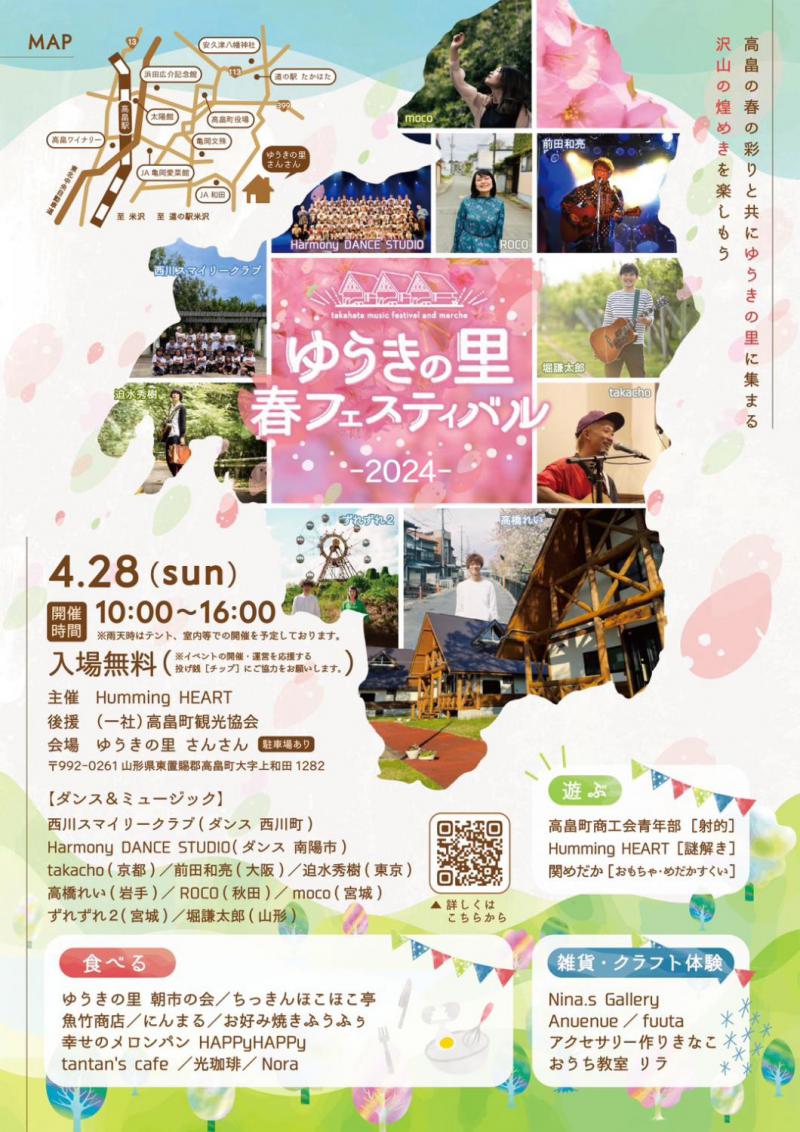 県内外の新進気鋭のアーティストによるミュージックライブを中心に美味しいものや楽しい体験などが集まります!高畠町の春の彩りと共に「ゆうきの里」に集まる沢山の煌めきを楽しもう!入場無料!ぜひ遊びに来てください♪◆開催日:4月28日(日) 午前10時〜午後8時◆場 所:ゆうきの里さんさん 〒992-0261 山形県東置賜郡高畠町上和田1282 Googleマップリンク ◆内 容・アーティストの紹介などを掲載の特設ページはこちらから(堀謙太郎 anchor Official Website)・Instagramアカウントにてマルシェ出店のご紹介をご覧ください<ダンス&ミュージック>西川マイスリークラブ(ダンス 西川町)Harmony DANCE STUDUO(ダンス 南陽市)takacho(京都) / 前田和亮(大阪)迫水秀樹(東京) / 高橋れい(岩手)ROCO(秋田) / moco(宮城)ずれずれ2(宮城)/ 堀謙太郎(山形)<食べる>・ゆうきの里朝市の会(和田地区の特産品)・ちっきんほこほこ亭(唐揚げ、チュロス)・魚竹商店(イカ焼き、日本酒)・にんまる(シフォンケーキ)・お好み焼きふうふぅ(たこ焼き、牛タンつくね)・幸せのメロンパンHAPPyHAPPy(メロンパン)・tantan's cafe(クレープ)・光珈琲(コーヒー)・Nora(ワイン)<雑貨/クラフト体験>・Nina.s Gallery(マクラメ編み雑貨)・Anuenue(ベビー&キッズのヘアアクセサリー)・fuuta(ベビーヘアアイテム)・アクセサリー作りきなこ(アクセサリーワークショップ、販売)・おうち教室 リラ(シュガークラフト)<遊ぶ>・高畠町商工会青年部(射的)・Humming HEART(謎解きゲーム)◆主催 Humming HEART Instagramはこちらから Xはこちらから 後援 (一社)高畠町観光協会