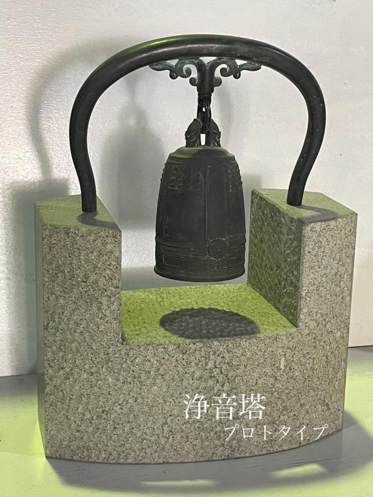 前回、紹介させていただいた『浄音塔』のプロトタイプ?試作品?室内用?になります。写真だけではサイズ感が伝わりづらいのですが前幅約20センチ 高さ約30センチのコンパクトめな石になっています。また、鐘は寺院にあります鐘と同じ格好をしていますが、きちんと手のひらサイズになっています!