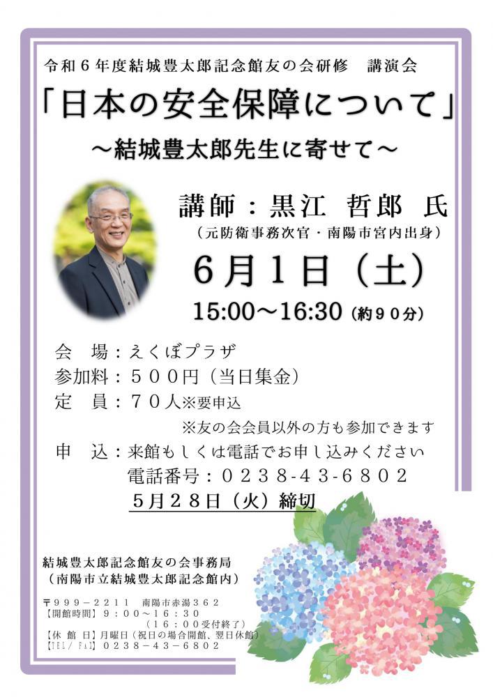 「日本の安全保障について〜結城豊太郎先生に寄せて〜」講師:黒江哲郎氏(元防衛事務次官) ※会員以外の方も参加できます。日時:6月1日(土)15:00〜16:30場所:赤湯公民館(えくぼプラザ)定員:70名参加料:500円(当日集金)申込締切:5月28日(火)結城豊太郎記念館(tel 43−6802)へお申し込みください。