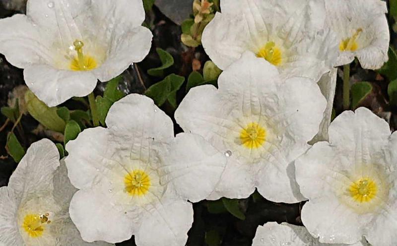 ●背丈が2〜3cmくらいで旺盛な根を四方に伸ばし地面を這うように増えていく植物「ギンパイソウ(お酒のグラスに似ているので銀杯草 あるいは盃花とも呼ばれる)」が10円玉ほどの白い花を咲かせてくれました 眩しいほどに白くきれいな花だったので数年前に知人から数株をいただき植えたものです 日当たりを好みますが浅く根をはるので湿り気が必要で強い日差しや高温時には枯れそうに弱ってしまうので水をやる必要があります
