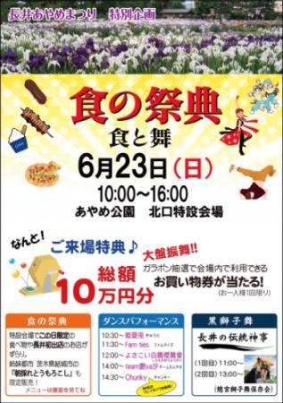 食の祭典 日時:6月23日(日) 10:00~16:00会場:長井あやめ公園 北口特設会場 例年、好評をいただいております「食の祭典」を開催!長井市の美味しいお店や長井市外のお店あわせて15店舗が集結。ご来場特典♪ 総額10万円分のお買い物券が当たる!ガラポン抽選で会場内で利用できるお買い物券が500名様に当たる!(お1人様1回限り) ◆━━━━━━━店舗紹介━━━━━━━━━◆高橋鯉屋・水上屋・菅製麩所・じんぐう寺農園・長沼酒造・はぎ苑・須藤米店・アイデアのおもちゃ箱・草岡ハム加工組合・CONCEPT-99MILKS・ガルバンゾー・SUKOFRU・東菓茶(初)・はまだ牧場ジェラート工房(初)・HAVE A GOOD SLICE(初)◆━━━━━━━━━━━━━━━━━━━━◆姉妹都市「茨城県結城市物産展」朝採れとうもろこし販売!10:00~ 売り切れ次第終了。お早めにお越しください。 また、ダンスパフォーマンス・黒獅子舞も見どころ満載です。タイムスケジュール10:30~ 姫憂兎(きゅうと) 11:30~ Fam ties(ファムタイズ)12:00~ よさこい白鷹櫻鷹會(しらたかおうようかい)初参加 14:00~ team艶ya沙(チームえんやさ) 14:30~ Chunky(チャンキー) 長井の伝統神事 黒獅子舞(總宮獅子舞保存会) 【1回目】11:00~ 【2回目】13:00~ 皆様のお越しをお待ちしております。