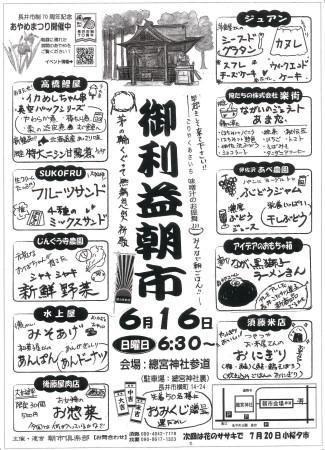 日時:6月16日 6:30~場所:總宮神社参道  (長井市横町14-24) 「御利益朝市」が開催されます。今回は先着50名様におみくじ贈呈!また、お味噌汁の振る舞いが行われます。早起きして朝市会場へお越しください。 出店店舗高橋鯉屋(イカめしちゃん串)SUKOFRU(フルーツサンド)じんぐうじ農園(新鮮野菜)水上屋(みそあげ)後藤屋肉店(お惣菜)須藤米店(おにぎり)ジュアン(シーフードグラタン)俺たちの株式会社 楽街(あま恋)伊佐沢 あべ農園(ぶどうジャム)アイデアのおもちゃ箱(ながい黒獅子ラーメンまん) ☆.。.:*・°☆.。.:*・°☆.。.:*・°☆☆.。.:*・°☆.。.:*・°☆.。.:*・°☆見頃予想や最新状況などは、随時こちらの「長井市ポータルサイト」でお知らせします!是非チェックして下さいね!!長井あやめ公園のリーフレットや長井市の観光パンフレットの送付も行っております。ご希望の方はこちらからお気軽にお問い合わせください! 【長井市観光協会 公式アカウント】長井市観光協会ではFacebook・Instagramのアカウントを作成しております。桜、白つつじ、あやめの開花状況をお知らせする他、イベントの情報発信を行う予定です。是非お目通しくださいませ(*^ω^*)!!FacebookInstagram☆.。.:*・°☆.。.:*・°☆.。.:*・°☆☆.。.:*・°☆.。.:*・°☆.。.:*・°☆