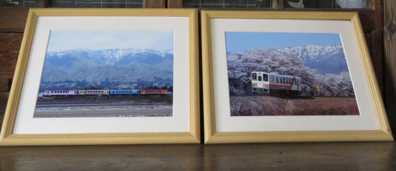 斎藤順一さんの作品です。長井線全線開通100周年を記念して走る4両編成の車両の背景には、葉山の山並み。まるでフラワーライナーを見守るように思えます。 もう一枚は「桜回廊を走る」。最上川橋梁にある撮影スポットですが、フラワー号の力強さが感じられます。斎藤さんは「残雪と桜が楽しめる写真をようやく撮ることができました」とのこと。