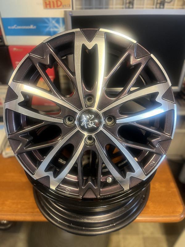 フロントラインです桜模様のアルミホイール中古品です正式名称は 和道 桜五分咲き らしいです カラーはバイオレットポリッシュ15インチ 軽自動車用です興味のある方はお問い合わせください フロントライン 0238-84-0506