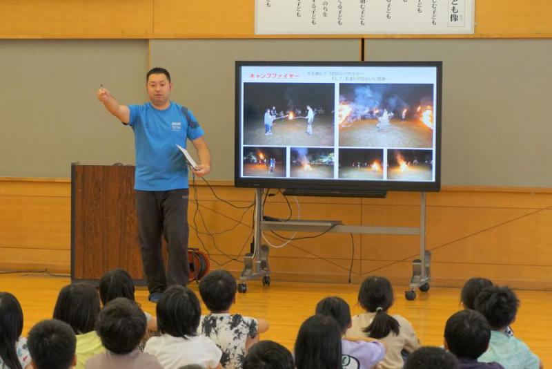 本日の全校朝会は、致芳地区コミュニティセンターの主事さんがいらして、夏休みに行われる事業の紹介と参加の呼びかけがありました。まずは、「ワイルドキャンプ」の紹介です。プログラムには、小刀を使っての箸作り、イワナの手づかみ漁、そのイワナを小刀で捌くこと等々。場所は白兎葉山森林公園で、高学年はキャンプファイヤーをして宿泊も。去年の活動の写真を興味津々に見ていました。申込者が増えそうです。そして、もう1つの紹介は、長井おどり大パレードへの参加の呼びかけ。仮装をしての参加も大歓迎とのこと。目標は致芳地区から100人の参加!、どれぐらいの参加があるか楽しみですね。こうして、コミセンと日常的に連携できるのも本校の特色です。これも「スクールコミュニティ」としての姿だと思っています。