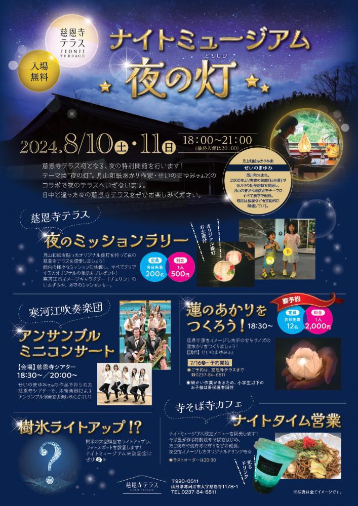 慈恩寺テラスでは、初となるナイトミュージアムを開催します!日中とは一味違う慈恩寺テラスをぜひお楽しみください。 イベントの詳細はこちら(外部サイト)