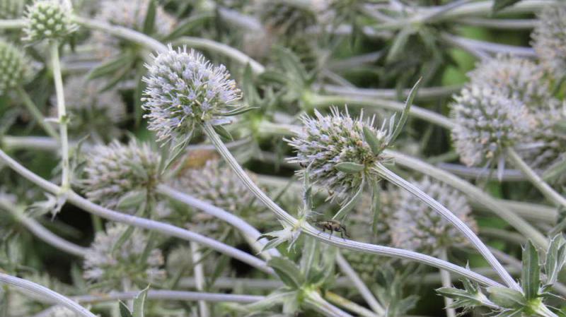 ●球状に紫色の小花が集まりその周りをとげのある苞が広がっている「エリンジウム」が咲いていました 「マツカサアザミ」と呼ばれる名前が一般的で多く栽培されているとのことです 分枝してにぎやかに咲いており色も涼しげで今の季節にぴったりの花で長持ちしてドライフラワーとしても利用される花だそうです