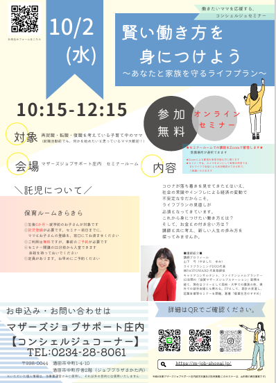 『賢い働き方を身につけよう!』〜あなたと家族を守るライフプラン〜開催のお知らせです。Zoomでも配信します! コロナが落ち着きを見せてきたとはいえ、社会の常識やインフレによる経済の変動で不安定な今だからこそ、ライフプランの見直しが必須となってきています。これから身に着けていきたい働き方とは?そして、お金との付き合い方は?講師と共に考え、新しい人生の歩み方を探ってみませんか。【日 時】10月2日(水)10時15分〜12時15分 【対 象】再就職・転職・復職を考えている子育て中のママ※就職活動前でも何かを始めたいと 思っているママも大歓迎! 【会 場】 マザーズジョブサポート庄内 セミナールーム または ご自宅でオンライン受講(Zoom)【受講料・託児料】 無料【託児】 ※事前登録・予約が必要です 保育ルーム開室日【水・木・金】の 10:00〜16:00に登録にお越し下さい。※併設の保育ルームで、保育スタッフが お子さんをお預かりします。 ママは安心して受講いただけます。●ご自宅でオンライン受講ご利用の方へ●・インターネット環境が必要になります。 通信料は自己負担です。・パソコン、スマートフォン、 またはたタブレットをご準備いただき、 事前にZoom meetingを ダウンロードしてください。・セミナー中はカメラをオンにし、 お顔の見える状態で受講して下さい。 【駐車場について】お車でお越しの際は、中町庁舎脇にある〈セントラルホテル契約駐車場〉をご利用ください。(ジョブプラザさかたと表示してあります。)※契約駐車場が満車の場合は、酒田市中央地下駐車場をご利用ください。無料駐車券(最大2時間)を発行いたします。お帰りの際に、コンシェルジュ窓口へお声がけください。 ◇お申込み・お問い合わせ◇マザーズジョブサポート庄内TEL:0234-28-8061メールでのお申込みはコチラ