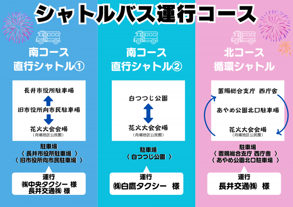 8月3日(土)に開催を予定しております、最上川花火大会時の無料シャトルバス運行についてのお知らせです。 運行時間/午後5時30分〜午後10時 花火会場の発着場所は「舟場公民館」を予定しております。北コースは循環、南コースは直行便です。 コースに関しましてはこちらの記事の上部、花火大会プログラムに記載されております。事前に会場付近の駐車場や、シャトルバスのコースをご確認いただけますよう、御協力をお願い致します。 尚、午後5時以降の会場内への車の乗り入れはできませんので、予め御了承ください。