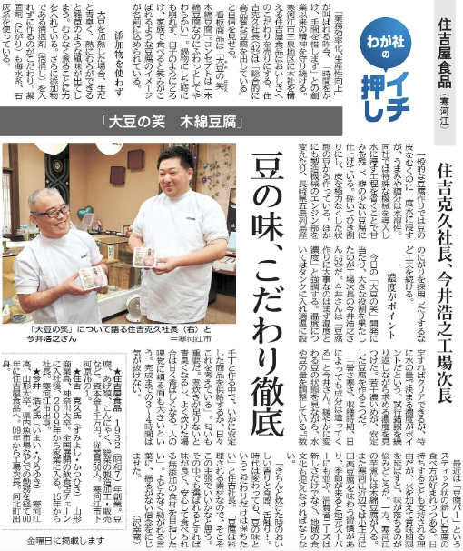 山形新聞(7/26)経済欄にて「大豆の笑 木綿豆腐」が掲載いただきました。ありがとうございます!