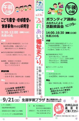 本イベントは終了しました。ご参加ご協力ありがとうございました。尚、午後の部として開催を予定しておりました「ボランティア講師の皆さんによる活動披露会」は荒天が予想されたことから参加者様の安全を考慮し、午後の部を中止とさせて頂きました。参加を楽しみにしていただいた皆様には、ご迷惑をお掛けいたしましたこと、心よりお詫び申し上げます。ー・ー・ー・ー・ー・ー・ー・ー・ー・ー・ー・ー・ー・ー・ー・ー今年のふれあい福祉まつりは”午前・午後二部制”で行います!参加費無料!午後の部ではビンゴ大会もアリ!ぜひぜひご参加ください!第23回ふれあい福祉まつり 「こども食堂・地域食堂の実践事例がわかる研修会」 「ボランティア講師の皆さんによる活動披露会」(長井市市制施行70周年記念事業)コロナ期間を経て昨年度から再開いたしました「ふれあい福祉まつり」ですが、今年度は、下記のとおり午前・午後の2部制とする内容での開催を計画いたしました。内容にご興味・ご関心のある方々のご参加をお待ち申し上げます。お気軽にご参加ください!1.基本情報@期日  令和6年9月21日(土)※詳しい時間は下記「2.イベント内容」を参照くださいA場所  長井市置賜生涯学習プラザ1F 舞と音楽のホールB主催社会福祉法人 長井市社会福祉協議会C参加費 無料Dその他昼食の準備はございませんのでご了承下さい2.イベント内容【午前の部】「こども食堂・地域食堂の実践事例がわかる研修会」 ★こども食堂に興味のある方などにおすすめ!!@時  間午前9時30分〜午後12時(午前9時開場) A参加対象こども食堂・地域食堂に興味のある方B定  員40名(事前申込制)※定員になり次第締め切りとなりますC申込下記チラシ裏面の参加申込書を参照いただき、電話、FAX、メールにて長井市社会福祉協議会までお申込みください第23回ふれあい福祉まつりチラシ.PDFD申込期限 9月5日(木) E内  容・こども食堂、地域食堂の基本情報、活動のポイント・地域食堂の市内の実践団体の事例紹介・講師、実践者との交流会【午後の部】 「ボランティア講師の皆さんによる活動披露会(ビンゴ大会あり!)」★高齢者の方やボランティアに興味のある方におすすめ!!@時  間午後2時〜午後4時30分 (午後1時30分開場)A参加対象  ボランティア講師の活動(踊り、語り部、演奏など)をご覧になりたい方(老人クラブ・ミニデイなどの皆さまのご参加をお待ちしております)B定  員200名(事前申込制)※定員になり次第締め切りとなりますC申込下記チラシ裏面の参加申込書を参照いただき、電話、FAX、メールにて長井市社会福祉協議会までお申込みください第23回ふれあい福祉まつりチラシ.PDFD申込期限 9月5日(木)E内  容  ・ボランティア講師の活動披露とインタビュー(演目(予定):歌、股旅舞踊、語り部、管楽器演奏など)・大ビンゴ大会ご不明な点は、長井市社会福祉協議会までお気軽にお問合せくださいどなたでも参加いただけます!午後の部は、参加賞(せせらぎの家のパンをプレゼント!)、ビンゴ大会もアリ!!ぜひぜひご参加ください!!