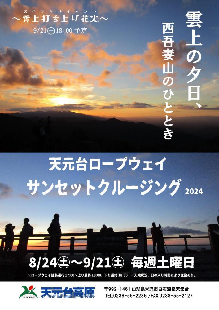 天元台高原「ロープウェイサンセットクルージング」8/24(土)〜9/21(土)開催!期間限定のロープウェイ延長運行企画!夕方のひとときを「サンセットクルージング」として展開いたします。また、最終日は午後6時からスペシャルイベント「雲上打ち上げ花火」を開催予定!(荒天の場合は中止となります。)みなさんのお越しをお待ちしています!◇期 間 8/24(土)〜9/21(土)までの毎週土曜日◇運行時間 17:00〜上り最終18:00、下り最終18:30◇料 金 通常往復(大人1,900円・小学生1,300円)◇お問い合わせ 天元台高原 TEL:0238-55-2236