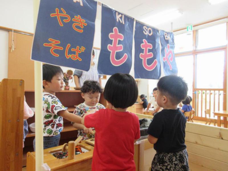 もも組の保育室に焼きそば屋の屋台が登場しました。園の夏まつりのとき、もも組のお父さんたちと保育者がやっていた『やきそば ももや』を再現したものです。暖簾を見た子どもたちは「焼きそば屋さんだ」「○○ちゃんのパパがジュージューして(焼いて)たよね」と大喜び。店員さんやお客さんになりきり、「いらっしゃいませ〜」「焼きそばくださーい」「100円です」「売り切れです」など、友だちとのやり取りを楽しんでいます。また、メダカも仲間入りしました。保育者と一緒に、水の交換や餌やりなどのお世話をする子もいます。『めだかのがっこう』を口ずさみながら、そ〜っと覗く子どもたちの姿にほっこりする毎日です。