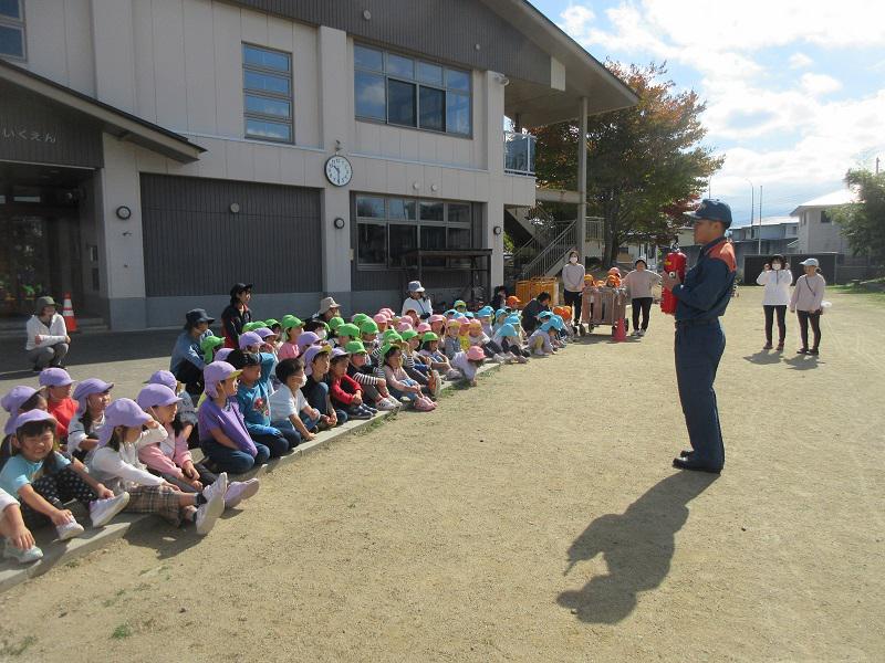 10月25日(金)に防災訓練がありました。この日は火災が発生したことを想定しての避難でしたが、子どもたちは保育者の指示に従って上手に避難することが出来ていました。また、今回は消防署の方に来ていただいて避難する様子を見てもらいました。そして消火器の使い方や消防車の中を見せてもらい、子どもたちは「これ、何?」「帽子かぶってみたい!」など興味津々でした!