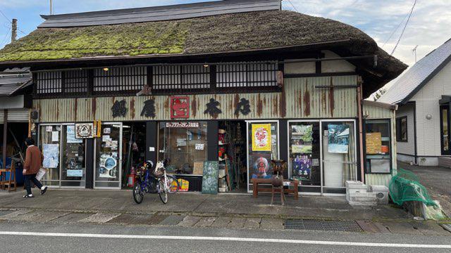 長井市十日町の金物店「鍋屋」は苔むす趣のある茅葺き屋根の古民家でもある。