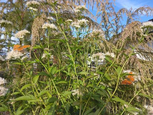 秋の庭は、まだまだフジバカマがいい役目をしてくれています。『アサギマダラ』は見かけなくなりましたが、毎日、集まってくる黄色い蝶!何種類かいて、名前はわかりませんがフジバカマの蜜が好きなんですね。 ↓また咲き始めた『アルストロメリア』植えっぱなしで咲いてくれる手の掛からない暑さにも強い花ですが、この”インディアンサマー”は銅葉が素敵〜!もう少し楽しんで、切り花で活けたいと思います。 ↓毎年、時季外れで咲いてくれる”ヒペリカム”探していたら、ありました! ↓10/25で話題になった『ベルケア』パープレアのつぼみが、少し開き始めました!開花、見れるかもしれませんね。でも、連休の天気予報は、台風情報が…今ごろ? 今日のバラは・・・どのバラも花数が少なく、一個撮りです。 じーじは、バラ鉢の土の入れ替え作業をせっせと進めています。古くなったバラは、さよならして鉢数減らしています。 今年は天候のせいか、冬じまい進んでいなくスローライフになっています。