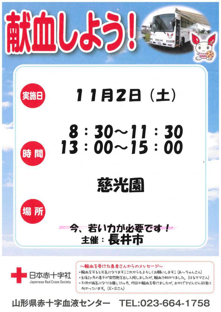 令和6年11月2日(土)今年も慈光園文化祭において企業献血を実施します。当法人では地域への社会貢献活動の一環として毎年行っております。当法人職員に加え、地域の皆様にもご協力いただき、献血の普及・啓発に貢献してまいります。詳細は慈光園(0238-88-2711)までお気軽にお問い合わせください。