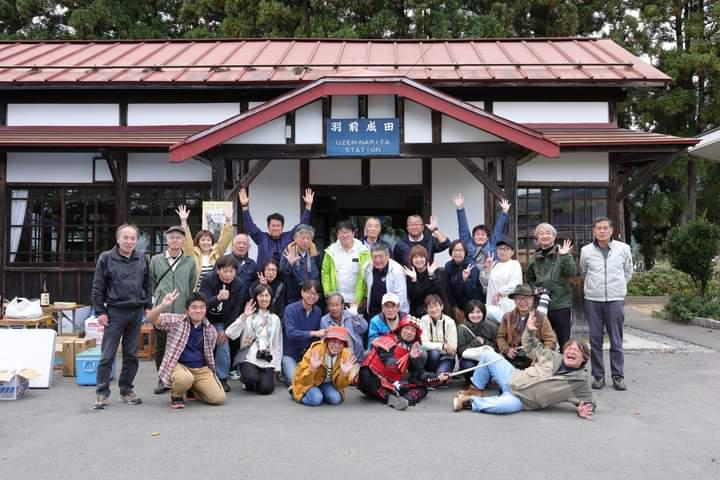 10月19日の前夜祭から始まった成田駅での長井線祭りが終了した。写真展を開催してくれた小野さん、オモチャのプレゼントやシャボン玉など子供たちを楽しませてくれたAさん、Nさん。また米屋さんはじめ多くの方々からたくさんの飲み物や土産品を差し入れしていただきました。ありがとうございました。? 米屋さんとの撮影ツアーにおいでになった皆さんには、印象に残った写真とコメントを寄せていただきました。そこには私たちが気づかなかったものがたくさんありました。また会場の設営や撤収にあたって、会員以上の手際よさを発揮してくれた姿も印象深いものでした。これを「縁」にぜひまた遊びに来てください。? 恒例となった駅前での記念写真を見て、この2日間は、迎える私たちと訪れた人々とが共に作り上げた事業だったのだ、と改めて思います。2023年4月に行われた広田泉さんを偲ぶトークショーで、米屋さんが語った「共にあること」という言葉が思い出されます。この場所で共にあること、そして新たなつながりや思い出が生まれていることに感謝します。本当にありがとうございました。また会える日を楽しみにして・・・。   (おらだの会一同)? → 広田泉伝 [ 完 ]  明日の一歩 共にあること:おらだの会