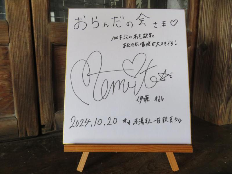 駅前での芋煮会が終了し、待合室で2次会が始まった頃、一日駅長の仕事が終わった伊藤桃さんが成田駅に立ち寄ってくれました。伊藤さんのインスタグラムからその一部を紹介します。 ///// 私がこうしてフラワー長井線に足しげく通うきっかけとなった大好きな羽前成田駅。100年を越える開業時からの木造駅舎。もちろんそれだけで最高なのですが、この駅の好きなところは地元の方々、おらだの会の皆様が駅舎を「人が集まる場所」として大切にしているところ。  遅れて来た私のために残していてくれた鍋に、改めて火を入れてくれたので、あつあつの芋煮をいただけました。すっごく美味しかったです。「どんどんけ」これは私の故郷の野辺地の方言ですが、こんなニュアンスの山形弁で勧めてくれて、おじいちゃんを思い出してほっこり。  帰り際に渡してくれたお弁当を、新幹線の中でいただきました。お昼に参加できなかった私のために、おかずを取り分けてお弁当にしてくれたのです。嬉しかったなぁ。もちろんお味も美味しくて、最後まで本当に幸せな気持ちにさせていただきました。本当にありがとうございました。(伊藤桃)///// 【おらだの会】奥さん方が気配りしてくれたんですね、良かったです。(家では怖い○○なのですが(笑)) 写真は、伊藤桃さんが残してくれた色紙です。
