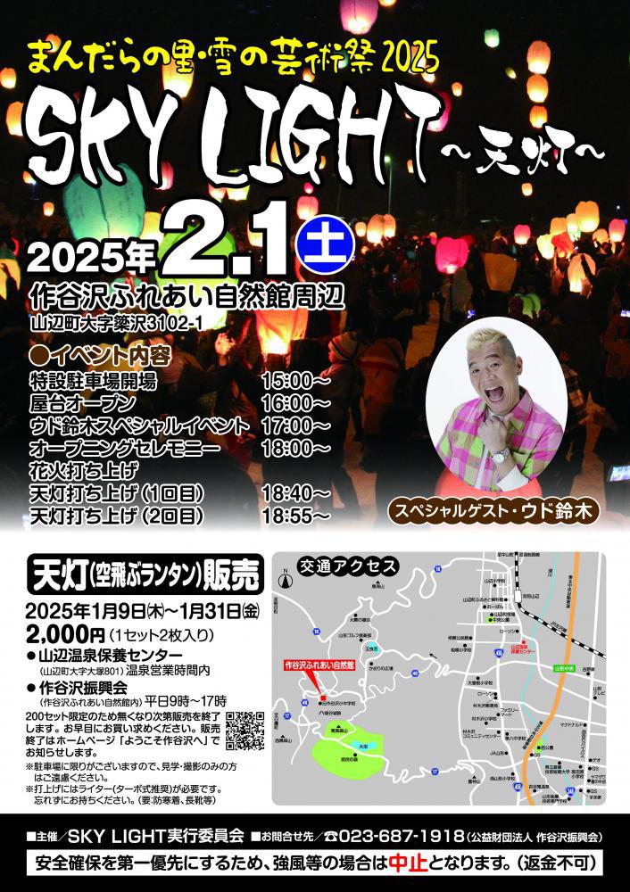 「まんだらの里・雪の芸術祭2025」を開催します。一面銀世界となる作谷沢で、天灯(空飛ぶランタン)の打上げを行います。ご友人やご家族、大切な人と一緒に願いを込めて天灯を打ち上げてみませんか。 天灯は下記場所にて2,000円(1セット2枚入り)で販売します。200セット限定のため、なくなり次第販売終了となります。〇販売期間:2024年1月9日(木)〜1月31日(金)〇販売場所 @山辺温泉保養センター 山辺町大字大塚801 販売時間:6:30〜21:00 A作谷沢振興会(作谷沢ふれあい自然館内)山辺町大字簗沢3102-1 販売時間:平日9:00〜17:00 ※駐車場は天灯購入者のみの優先利用となります。見学・撮影のみの方はご遠慮ください。お問い合わせ先/公益財団法人 作谷沢振興会 TEL:023-687-1918