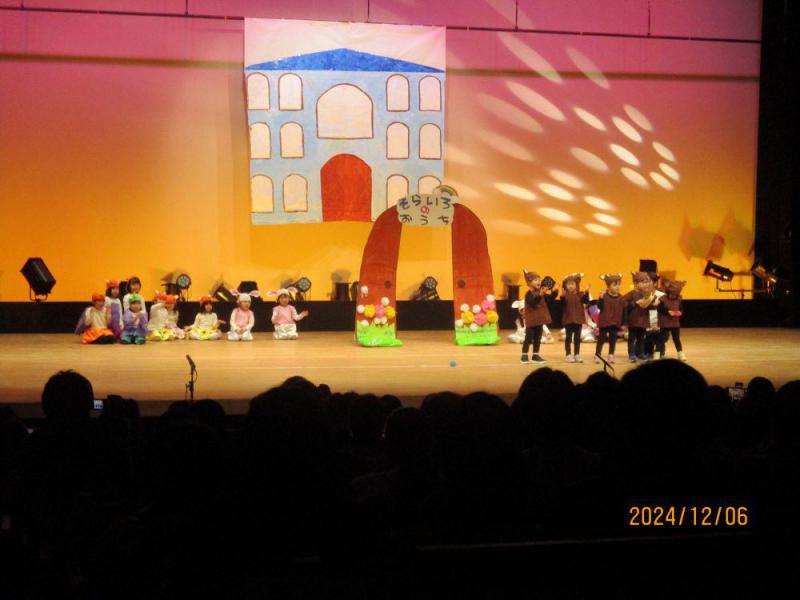 12月6日(金)、7日(土)の2日に渡り、きらきら発表会を開催しました。1日目は2〜5歳児が市民文化会館の大きなステージで、2日目は0,1歳児が保育園のお遊戯室で行いました。2〜5歳児は会場での練習なしでの発表ですが、堂々と楽しんで発表していました。0,1歳児はアットホームで温かい雰囲気での発表会でした。