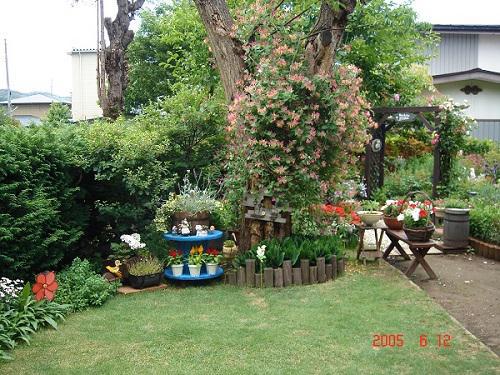 庭づくりを始めて、5年ちょっと!花壇からガーデンらしくなってきました。 写真の裏庭は、苔が生えているじめじめしたところで、“みょうが“がたくさん採れていた場所ですが芝を貼ってくつろげる場所に作りました。一番最初に手掛けたところですが、日当たりが悪くて上手く育たず何回か植え替えしました。環境が合わなかったんでしょうね・・・ 正面に写っている枯れ木は、大きな栗の木でしたが倒すのがもったいなくロニセラなどを這わせていました。それが今もシンボルとして残っています。 庭は、レンガで奥行き感のある通路を作り、また、パーゴラも作ったりでじーじのこだわりが感じられます!  今日は、2005年のガーデンを振り返り再度紹介(コピー)です〜♪ ================== 2019/03/27ブログより。。。 (回想)2005年のガーデンはこんな感じのガーデン!! 2005年には、ようやくガーデンらしくなりました!!枯れた栗の木には,ロニセラが満開デス(^^♪パーゴラの構造物(じーじ製作)も増えました。。。   2005年の”広域広報おきたま”「おきたま庭めぐり」へ、自薦で投稿。。。オープンガーデンのコメントあり  ↑初めてのスタンダード仕立てバラ。。。この頃は、まだ珍しかったと思う?  ↑ここにも、パーゴラが。。。すごい手づくり感?だけど、材質を考慮せずに製作し、長持ちせず。。。  ↑カーブの通路!(花壇づくりが上達した?)ピンクのキョウカノコがきれいに。。。  ↑レンガを敷き奥行き感をイメージしこの先に何がある? 期待感。。。緑の芝も映えていい感じです  ↑バラのアーチも増えました。。。  かわいい!!この頃は、お店でも買うことができました。今は、見かけないですね・・・   ↑秋の庭。。。すっかり秋いろ〜落ち着いた雰囲気 ================  2025/01/10コメント、今は。。。 芝の所は、維持できないので人口芝に変更!人口芝はまだ出がけで高価なものでした… 今のこのエリアは。。。 芝の一角は花も上手く育たない場所なので、ミニガーデンに〜♪  ↓クリの木には、モンタナ、ロニセラ、バラと色んなツル類が絡んでいますが、もう年数も立って花数も少なくなってきました。  ↓根元は、ばーばの趣味のコーナーに なっています。  ↓そして、脇にはガゼボ!(元は和風の東屋でした)じーじが色々手をかけてリノベーションしたところですが、老朽化しています。ここも、ばーばの趣味のコーナーです。