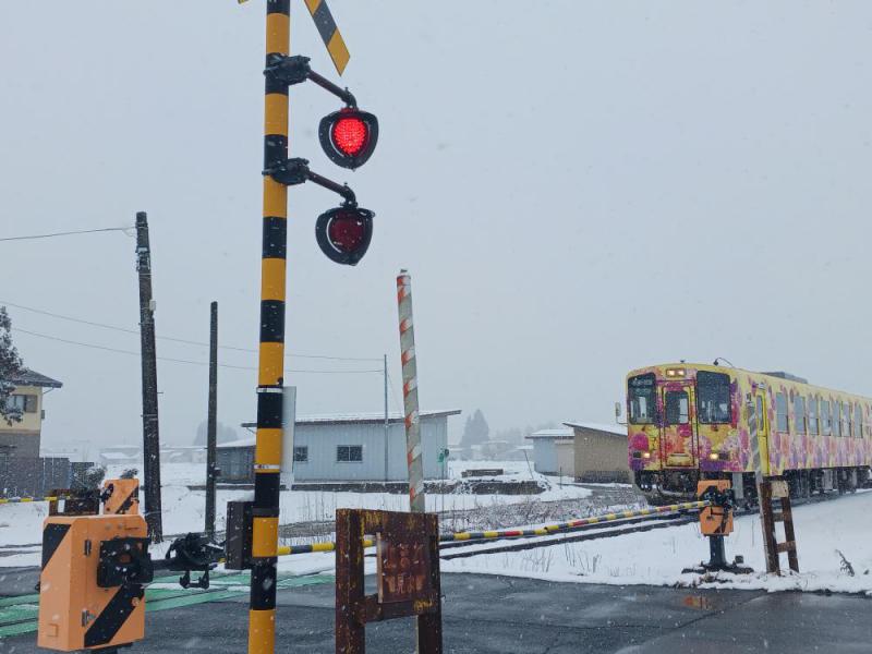 最後は成田第4踏切。東側の警報器は西舘や第2踏切と同じく、2基の赤色灯が横に並んでいます。そして西側に廻ってみると、写真のような設置になっています。なんと縦に配置された2基の赤色灯で対応しています。 よく見るとこれまでの赤色灯とは異なり、丸い電球そのものが付いており、その丸い電球を黒い壁が3分割しているのです。南北方向から見ると多少細長い楕円形に見えますが、ほぼ通常の赤色灯が光っているように見えます。 たった2基の電球でありながら、三方向いづれからも2基の赤色灯が交互に点滅して見えるのです。西舘踏切の横並び型よりはインパクトが弱く感じられるものの、2基の交互点滅方式によって、第2踏切よりも警報効果は強く感じられます。 5回にわたって付近の踏切を紹介してきましたが、如何だったでしょうか。「踏切は同じもの」と思っていましたが、立地場所や交通量さらに経費などを勘案しながら、導入システムを決定したのだろうと思います。フラワー長井線の楽しみ方の一つに加えてもらえれば幸いです。