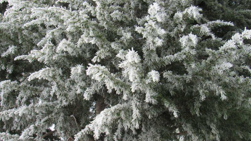 ●真っ白な霧氷 氷点下10度近くまで下がった寒い大寒の一昨日 木々に花が咲いたように霧氷ついていて寒さを物語る風景となりました 触ると木々の枝や針葉樹の葉が砕けるのではないかと思わせるように凍っていました まさに大寒の朝でした