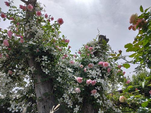 2023年には、素敵な風景に。。。 2021年、栗の枯れ木に絡ませていたつる性植物を剪定し、高齢バラ”スパニッシュビューティ"のシュートを誘引。 ===============================  2023/5/23ブログより。。。 オープンガーデンの頃には終わってしまう”スパニッシュビューティ"先日から何回も登場している“モンタナ”の中に埋もれて咲いています!さながら雪に埋もれたバラです。この様な風景は初めてです。。。”スパニッシュビューティ"は、バラを始めた頃の高齢バラですがシュートが出てくれたので”枯れ木(栗)”の方へ誘引してみたらこんなにも素敵な風景になるなんて。。。正解でした(^^) しかし・・・ ↓肝心の今までのアーチの所は、毎年花数が少なくなってきました。養分がとられているのかも・・・でも、一番の頑張り屋さんですね。このバラが咲き始めると、一番心ときめきます。  2023/05/16ブログより。。。 ”スパニッシュビューティ"はまだ開花していなくてモンタナだけが枯れ木を覆い隠すように咲いています。   ======================== 2022年5月は。。。 2021年に剪定したばかりでこんな感じです…