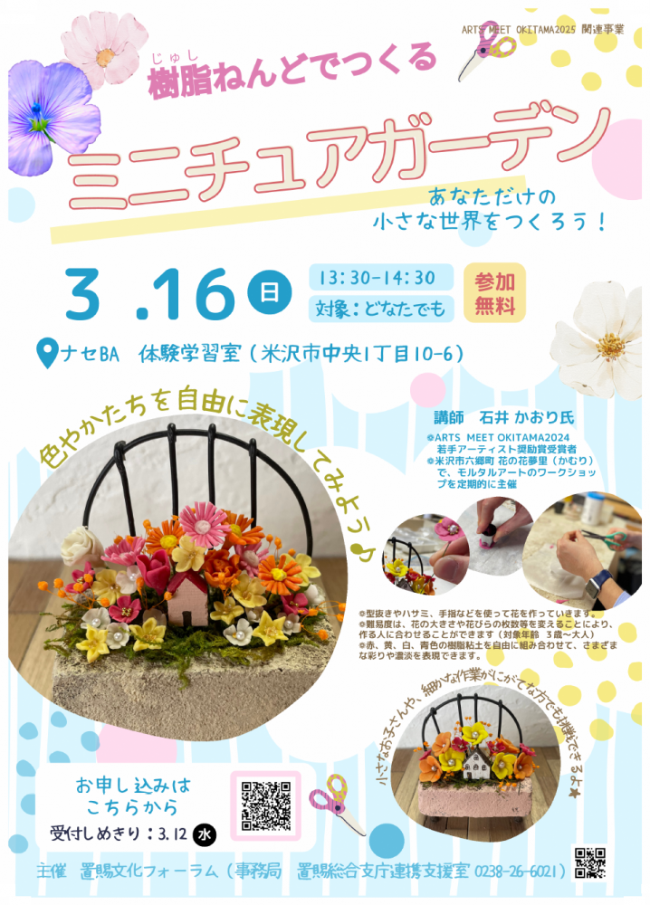 ナセBA体験学習室にて、「おきたま若手アーティストワークショップ」を開催します。ARTS MEET OKITAMA 2024若手アーティスト奨励賞受賞者の石井かおり氏を講師に、樹脂粘土を使ったワークショップを行います。樹脂粘土で好きな色・形の花を制作し、その花をモルタルの器にアレンジし、自分だけのミニチュアガーデンアートを制作します。ぜひ、ご参加ください。<開催日時>令和7年3月16日(日)13:30〜14:30<会場>ナセBA体験学習室(米沢市中央1−10−6)<参加費>無料<対象・定員>どなたでも10名(3歳以下のお子様は、保護者と一緒に参加してください。)【申込方法】下記申込みフォームより、お申込みください(先着順となります)。https://docs.google.com/forms/d/e/1FAIpQLSfSRC_wjgtavF52B_YjcqVzFreW9Nj71mZ0vkHCpXpazD9YDA/viewform申込〆切:3月12日(水)