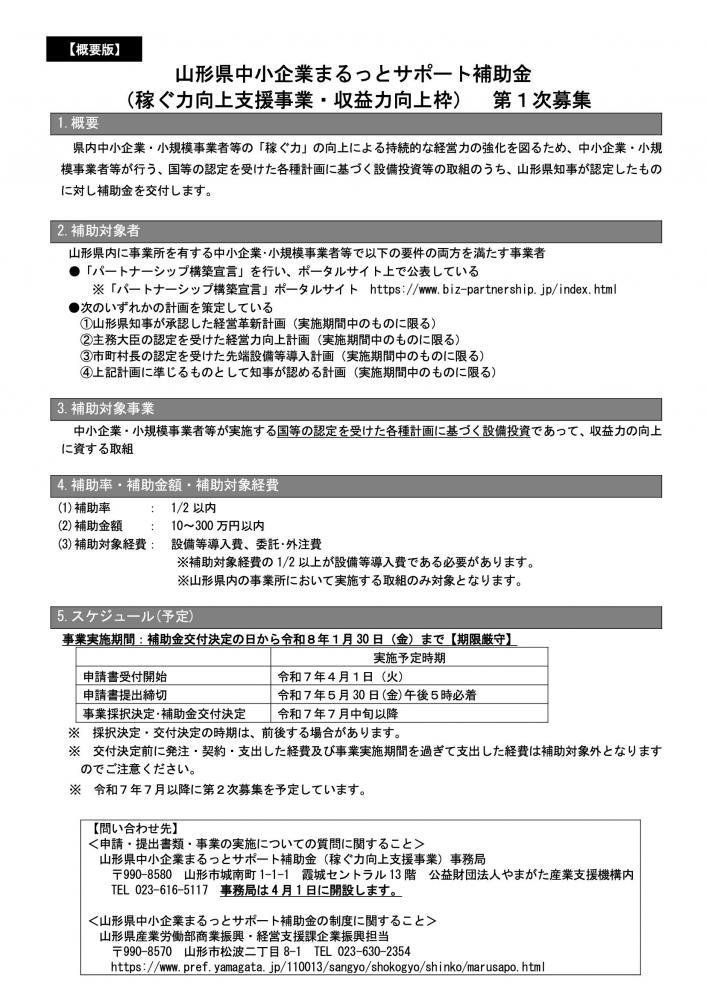 山形県では、新技術・新サービスの開発から設備投資、販路開拓まで切れ目なく一貫して支援し、本県産業の持続的発展のため、「中小企業まるっとサポート補助金」をスタートします。〇稼ぐ力向上支援事業(・収益力向上枠 ・DX推進枠)〇事業継続力強化支援事業等があります。詳細は、↓HPをご確認ください。山形県中小企業まるっとサポート補助金 | 山形県